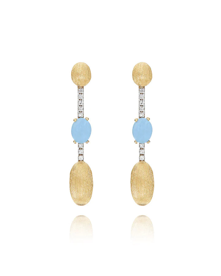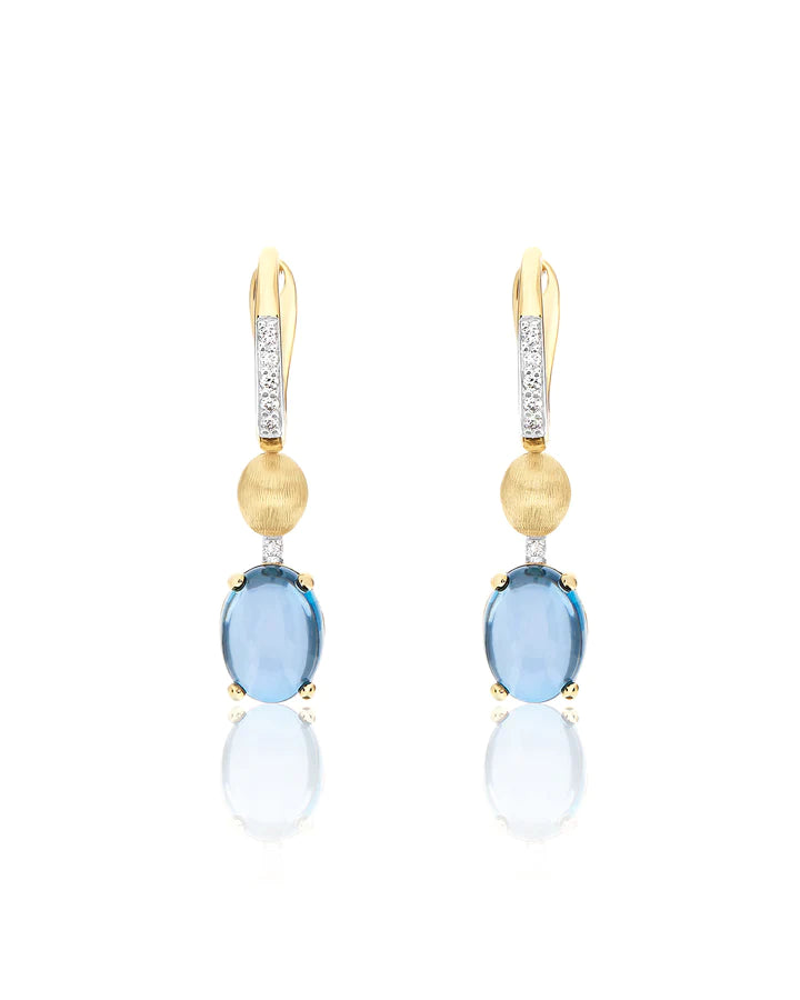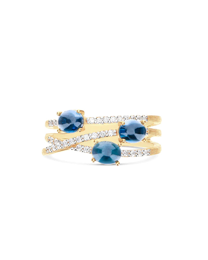 The aquamarine chosen for this collection is characterized by a milky, organic and delicate color and by internal veins, on the other hand, the London Blue topaz, is distinguished by its intense and at the same time transparent color, a true dive into the deep blue. The combination with hand-engraved 18kt gold surfaces exalts these colors even more, especially when worn together!