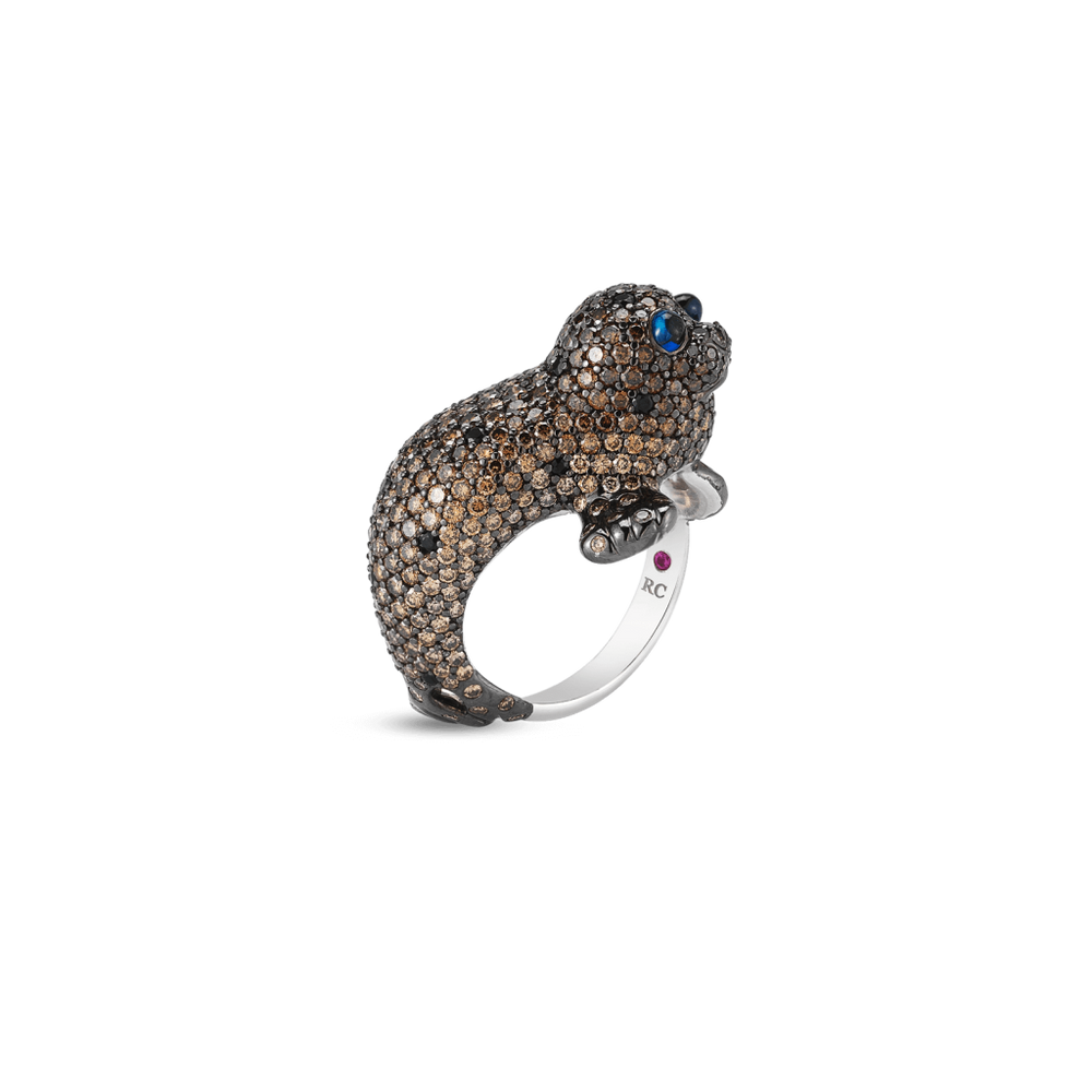 Seal ring in 18kt white and burnished gold with brown diamonds, black and blue sapphires.