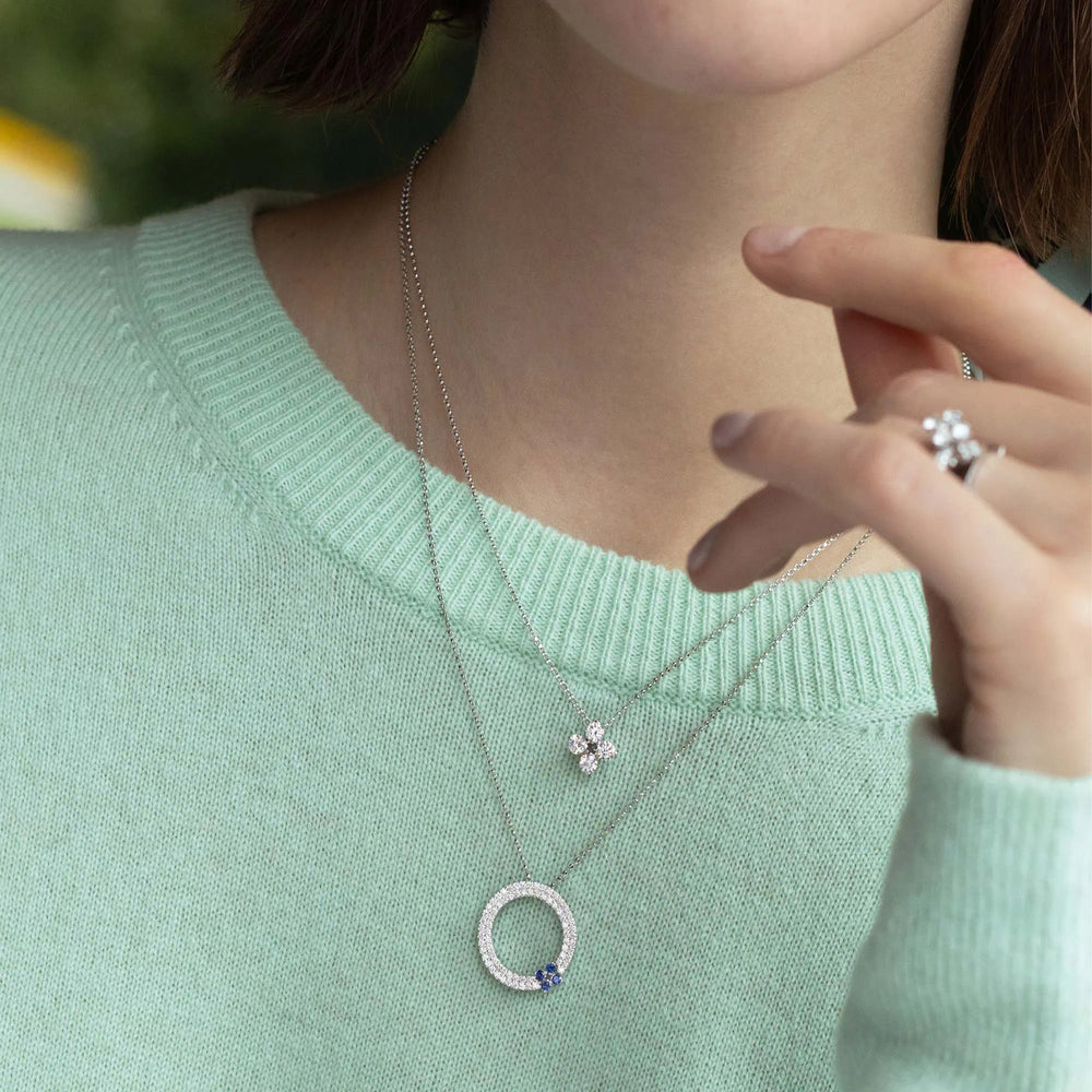 Blue sapphires are the misterious stars of this pendant by Roberto Coin, featuring 18kt white gold, diamonds and the uniqueness of an handmade jewel.